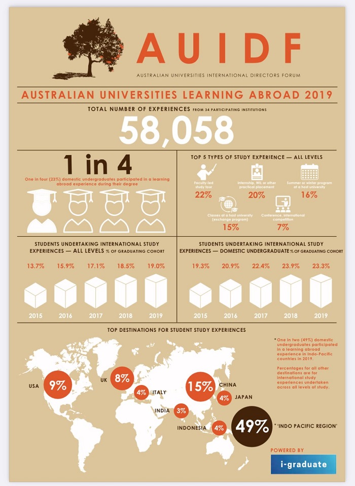 Over the past two decades, Australia has introduced multiple policy documents explicitly articulating the role of outbound student mobility in Australia’s social, cultural, economic and public diplomacy development, demonstrating a policy commitment to supporting students’ learning abroad. Policy documents such as the Bradley Review of Higher Education, the Global Alumni Strategy 2016-2020, the Australia 2020 Summit Report, the Foreign Policy White Paper 2017, the National Strategy for International Education 2025 and the New Colombo Plan, emphasise the critical need for promoting learning abroad. Supported by explicit policy frameworks and substantial funding, Australia has become a country with some of the highest participation of students’ learning abroad, with one in four students undertaking learning abroad as part of their degrees. Students from 34 Australian universities undertook 58,058 international experiences altogether in 2019. This is a more than threefold increase over the ten-year period 2009-2019, up from 15,058 in 2009.