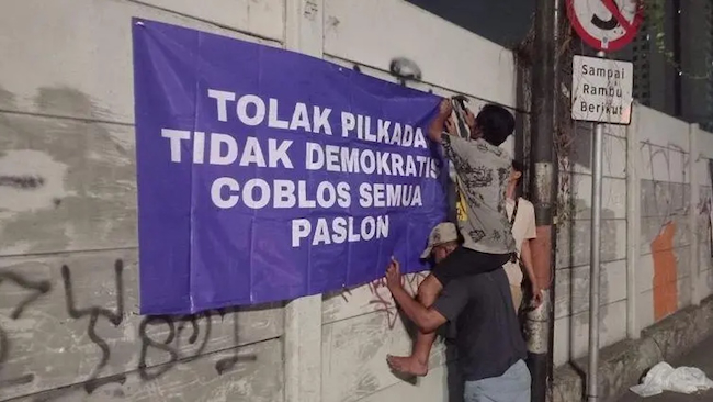Residents in North Jakarta put up a banner stating: ‘Reject the Undemocratic Regional Head Elections, Vote for All Candidates’ / Supplied